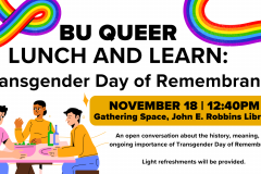 November 18, 2025 @ 12:30 pm - 1:30 pm BU Queer Lunch and Learn: Transgender Day of Remembrance Gathering Space, John E. Robbins Library
