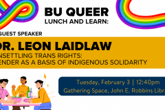 February 3 @ 12:40 pm - 1:30 pm BU Queer Lunch and Learn: Unsettling Trans Rights with Dr. Leon Laidlaw Gathering Space, John E. Robbins Library